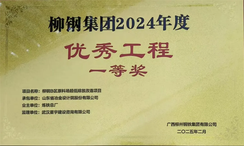 由山冶设计EPC总承包的柳钢B区原料场超低排放改造项目成绩斐然,荣获广西柳钢集团2024年度优秀工程一等奖及2024年度安全文明施工标准化工地两项殊荣,这体现了柳钢集团对该项目施工及现场管理的高度认可。
